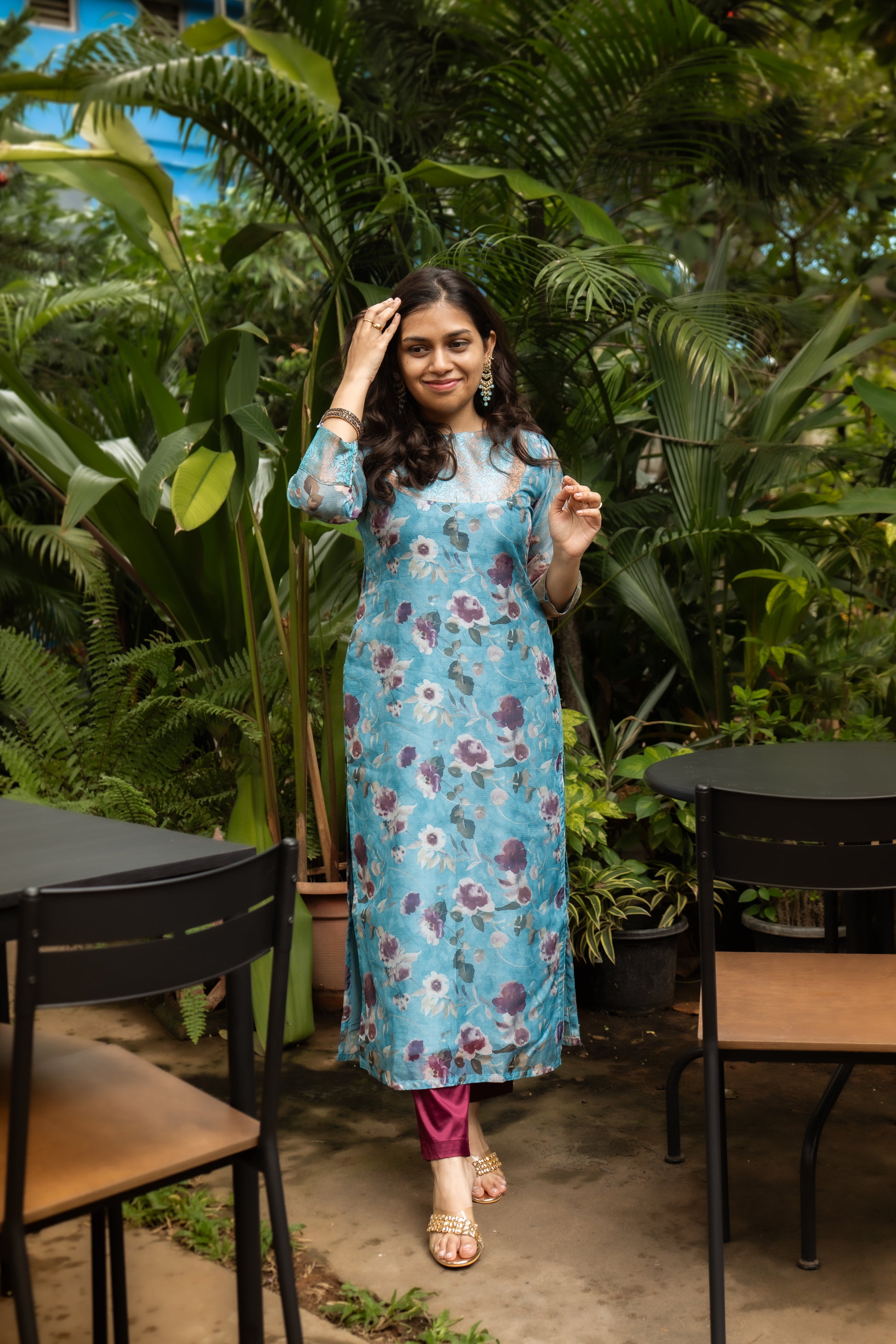 Delicate yet statement-making, this floral organza kurti is paired with a rich brocade yoke and intricate brocade detailing on the sleeves. Thoughtfully designed with lining for comfort and ease, it offers a graceful silhouette that blends festive charm with everyday elegance.