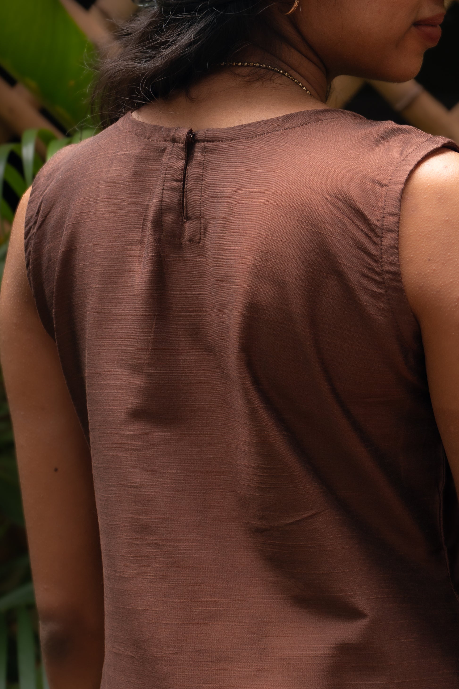 Crafted in rich brown cotton silk, this kurti features elegant raw silk and Mangalgiri border detailing that adds a subtle touch of tradition. Designed sleeveless for a sleek, modern look, with the option of attaching sleeves on request. A graceful choice for festive gatherings, workwear chic, or everyday elegance.