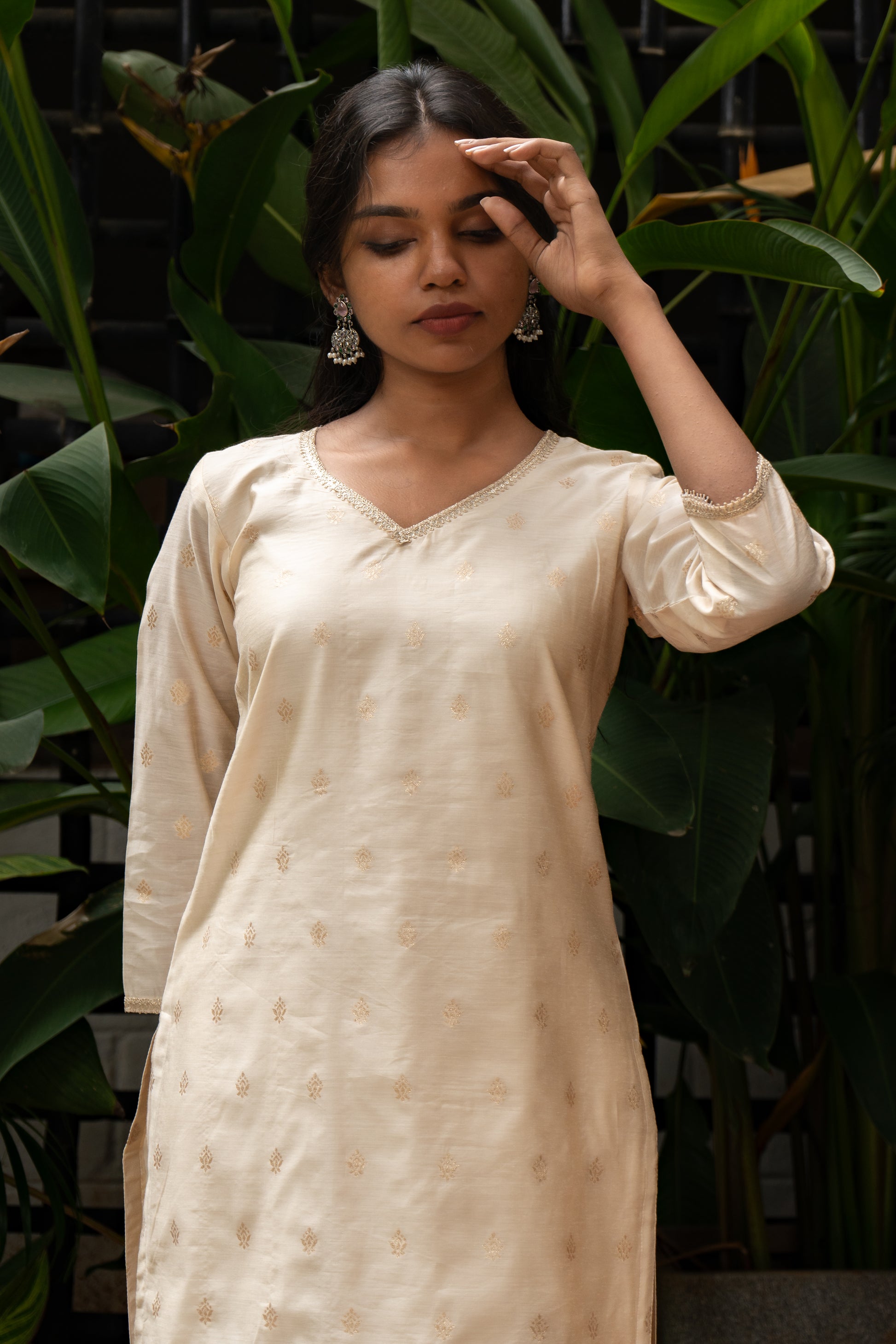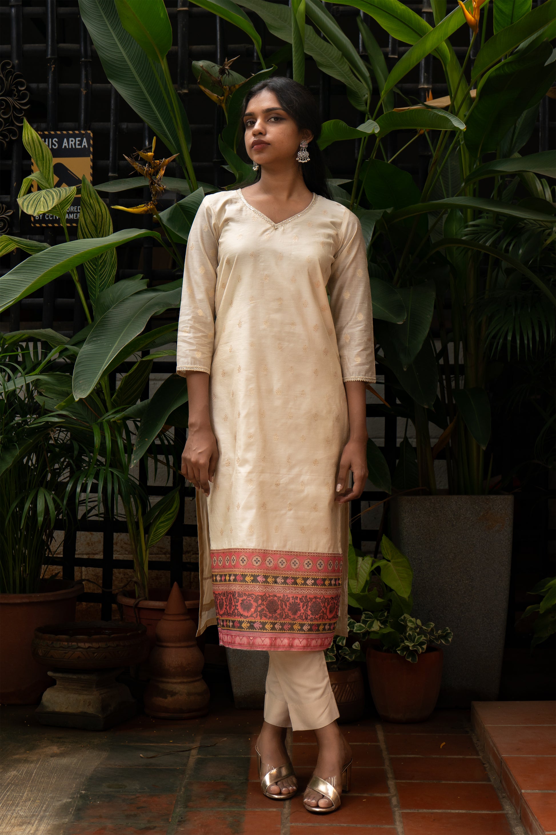 Elevate your ethnic wardrobe with this elegant cream chandheri kurti. The intricate gold motifs, combined with the vibrant printed tissue border, create a stunning contrast. The gold lace embellishments on the sleeves and the curved V-neck add a touch of luxury. The soft and flowy fabric ensures comfort and style. Perfect for special occasions, this versatile kurti can be paired with leggings, jeans, or palazzos.