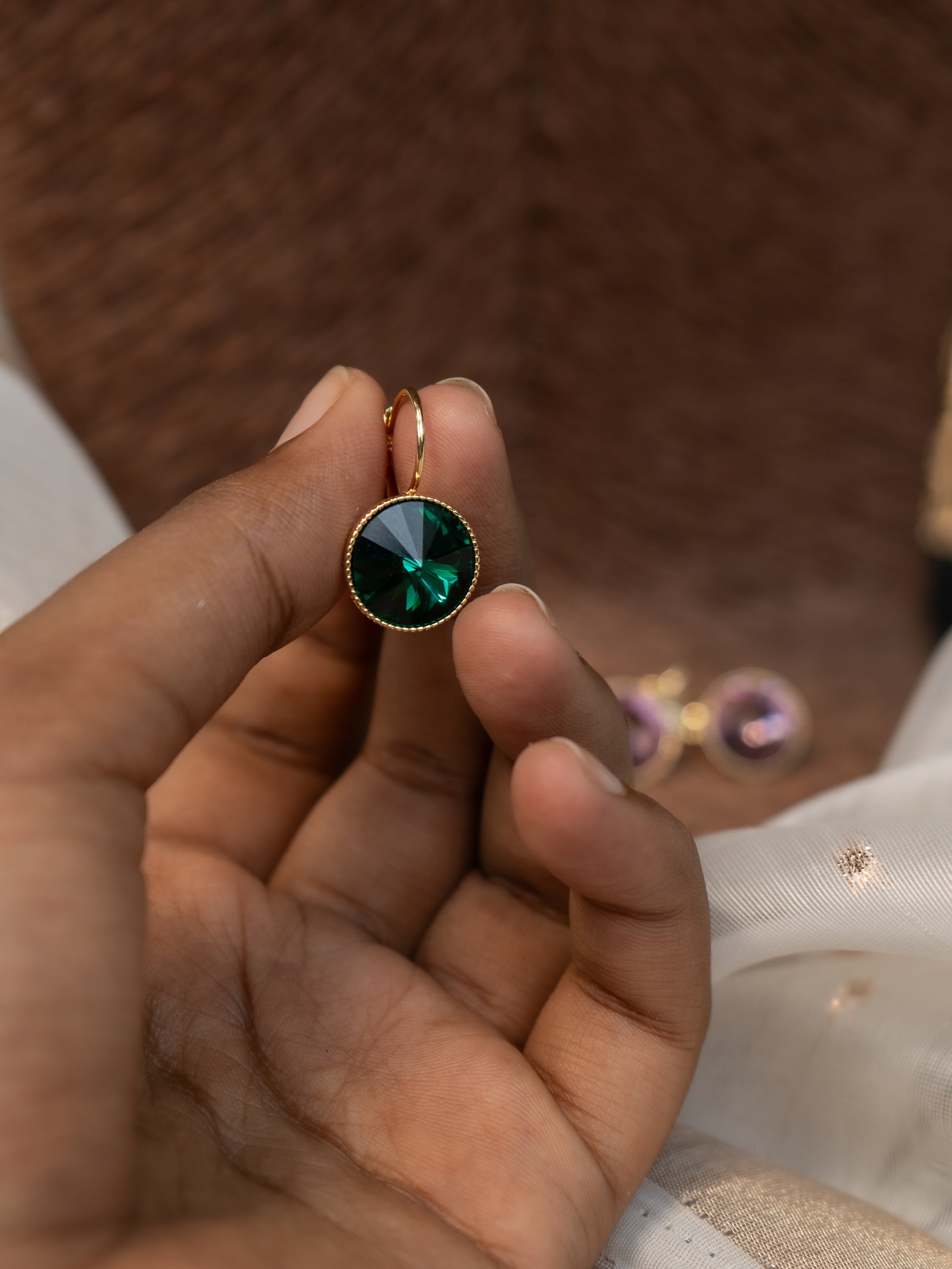 Delicate yet striking, these gem drop earrings feature a sleek gold-tone lockable hook and a small circular base that gently dangles below the ear. Accented with a smooth, rounded gem, they offer a perfect blend of subtle elegance and color. Available in emerald green, deep navy blue, and pastel pink, these earrings elevate casual, formal, official and festive looks with effortless charm and poise.