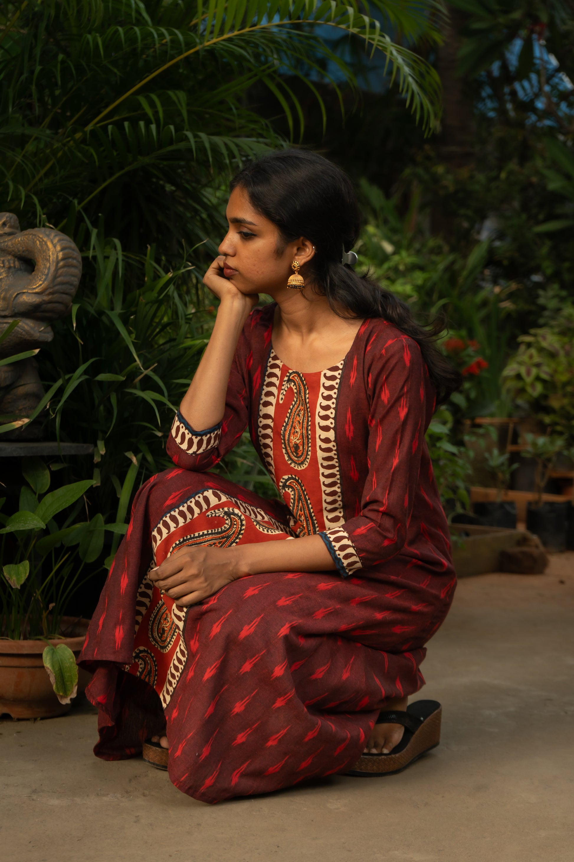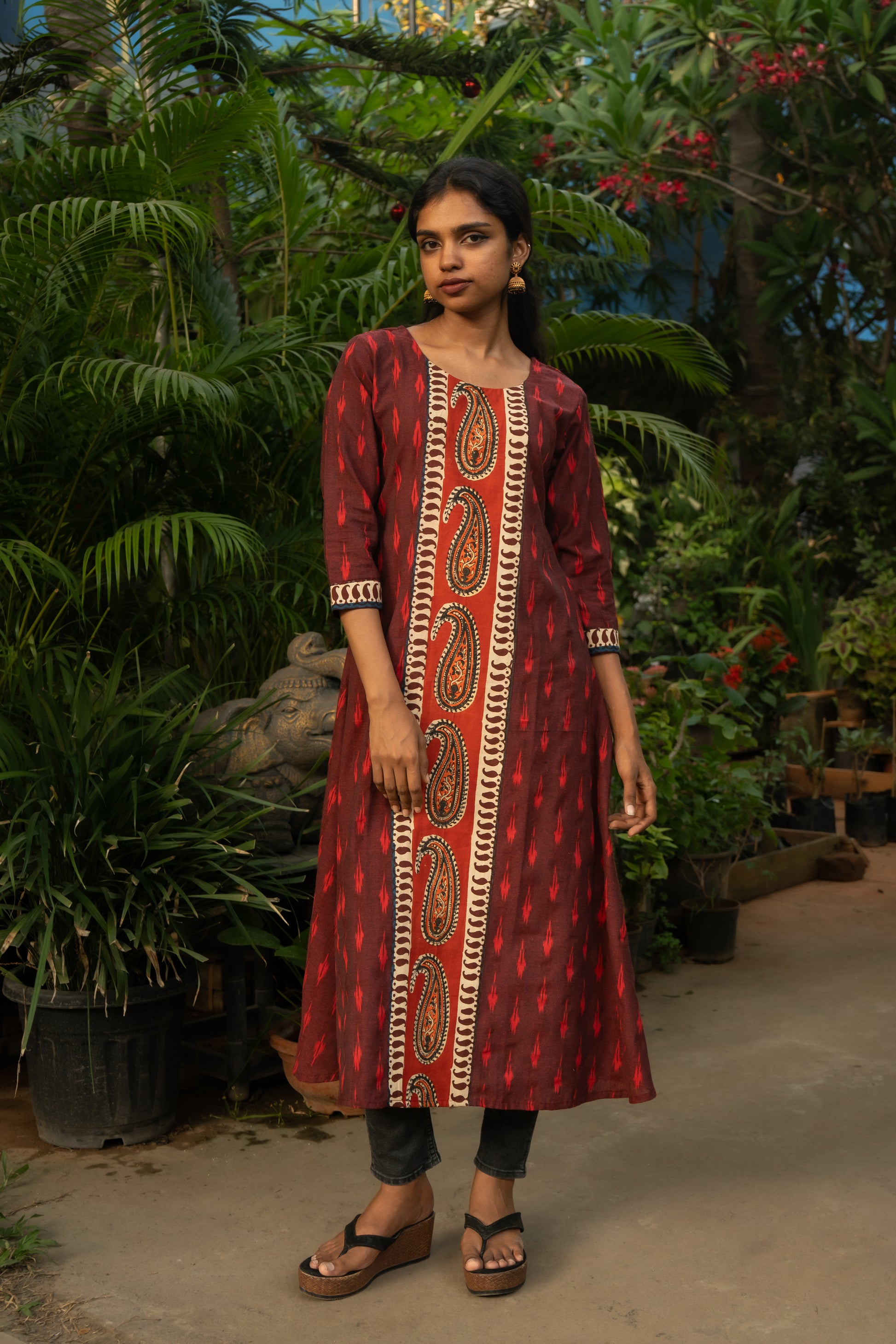 Add a touch of tradition to your wardrobe with Sakyaa's Maroon Ikkat A-Line Kurti, featuring a beautifully paisley printed centre panel yoke. Crafted from soft, breathable fabric, this kurti combines classic Ikkat patterns with timeless paisley prints, creating a rich ethnic look. The round neckline adds to its elegant appeal, while the A-line silhouetteensures a flattering fit. Perfect for festive occasions, casual gatherings, or even elegant office wear, this kurti is a versatile must-have for lovers of handcrafted Indian fashion.