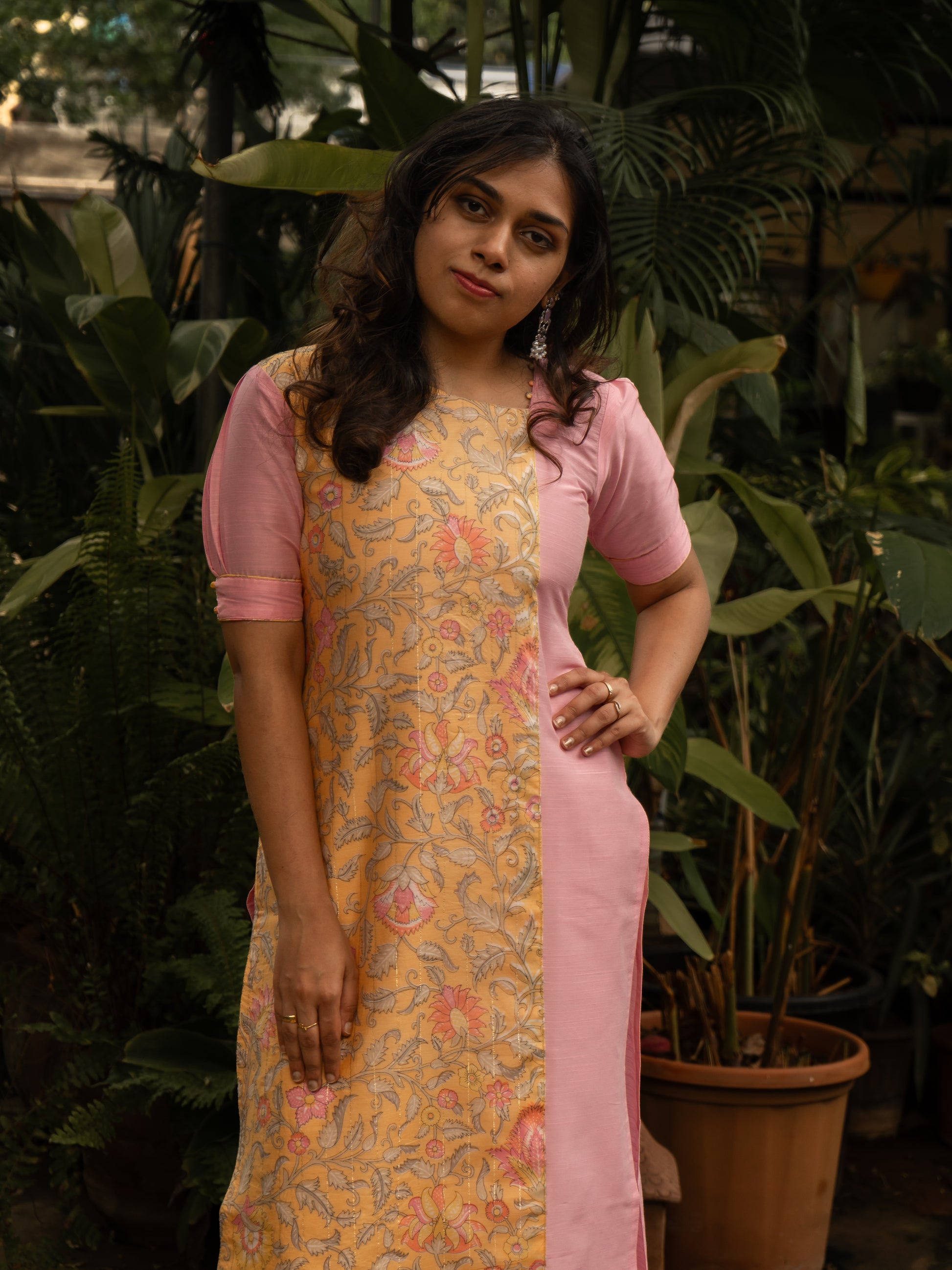 Elegantly handcrafted in-house by Sakyaa tailors, this light pink dupion silk kurti pairs a chic cross neck with a vibrant muslin accent. this kurti features a cross-neck design in lustrous light pink dupion silk, elevated by a yellow printed muslin side panel for fresh contrast. Finished with short puff sleeves, it delivers a modern silhouette while retaining Sakyaa’s signature long cut with side slits for ease and elegance. A versatile statement for festive moments, workwear chic, or refined casual days.