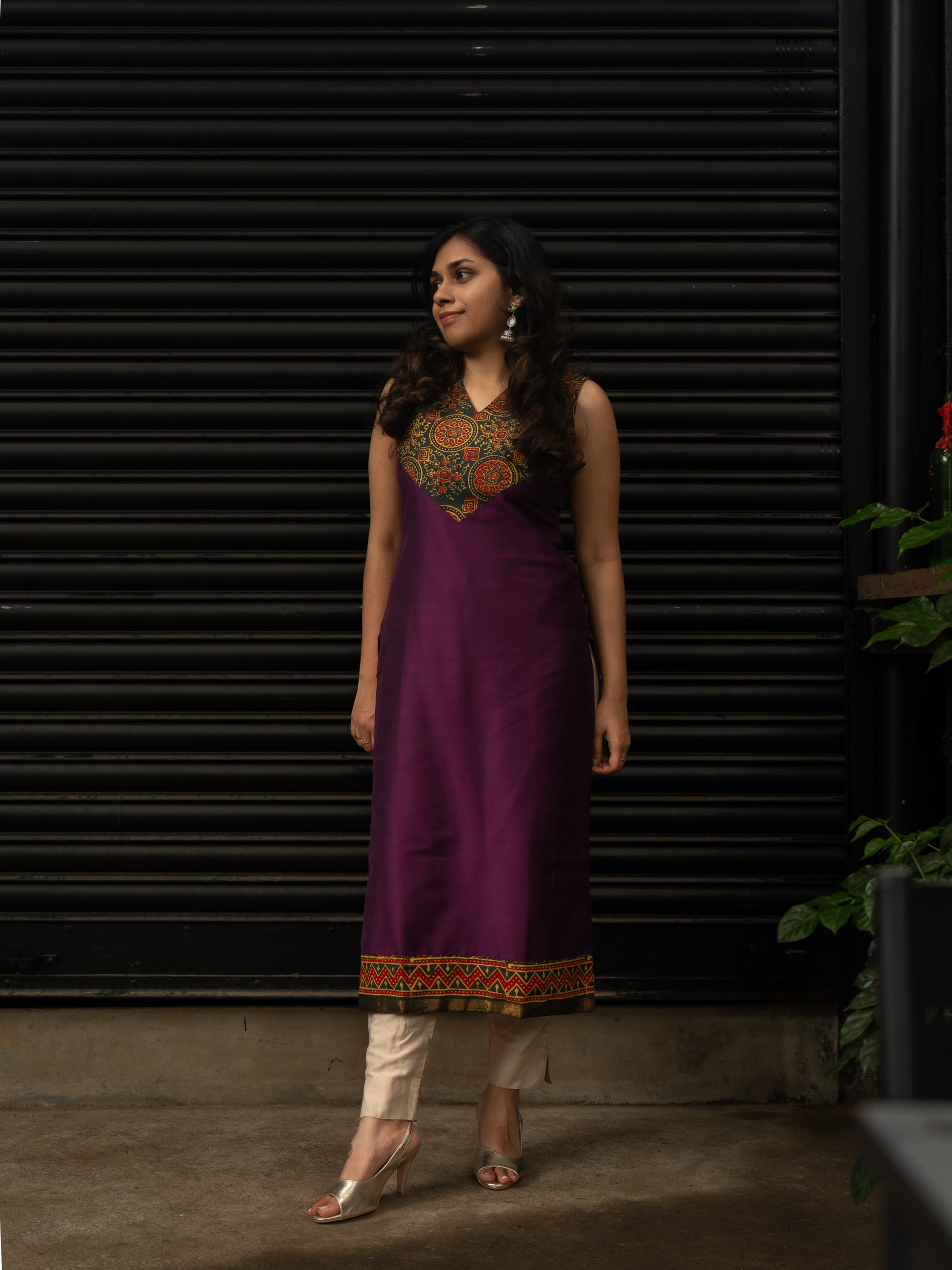 Stitched in our boutique studio, this purple dupion silk kurti highlights a striking V-shaped Ajrakh silk yoke at the front and complementary Ajrakh detailing at the hem. Designed with a clean V-neck and shown sleeveless in images, it also offers attachable sleeves on request for added versatility. The dupion silk body gives a subtle sheen while the Ajrakh panels add artisanal texture, together creating a contemporary-meets-traditional silhouette. Cut in Sakyaa’s signature long shape with side slits, it’s crafted for festive gatherings, cultural events, and stylish semi-formal wear. Every piece is designed and stitched in-house by Sakyaa tailors, ensuring boutique-quality finish and attention to detail.