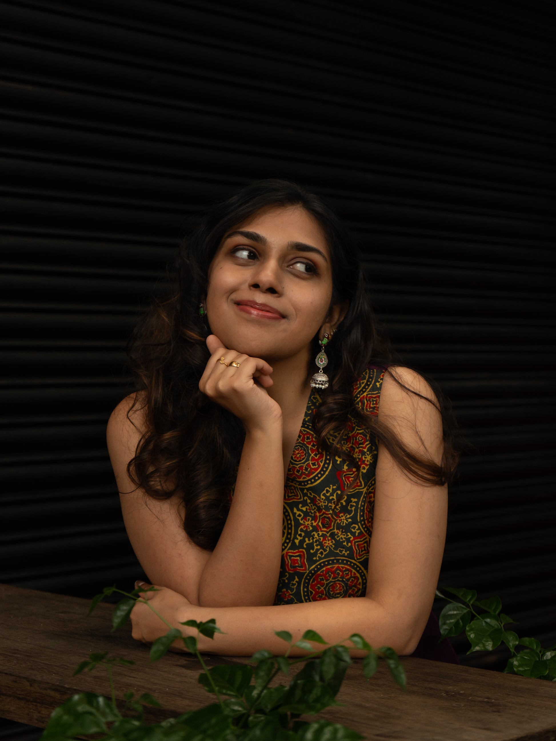 - Design: V-shaped Ajrakh yoke (front) and Ajrakh hem accents (bottom)