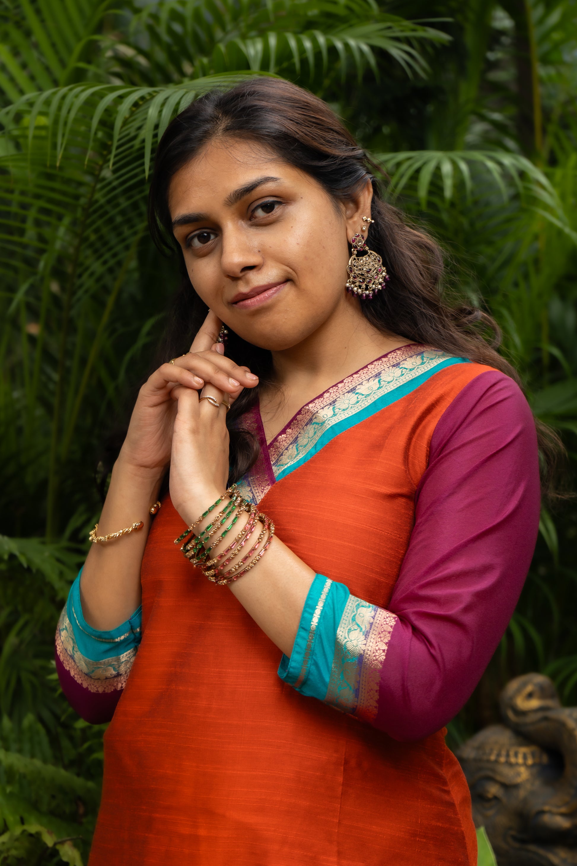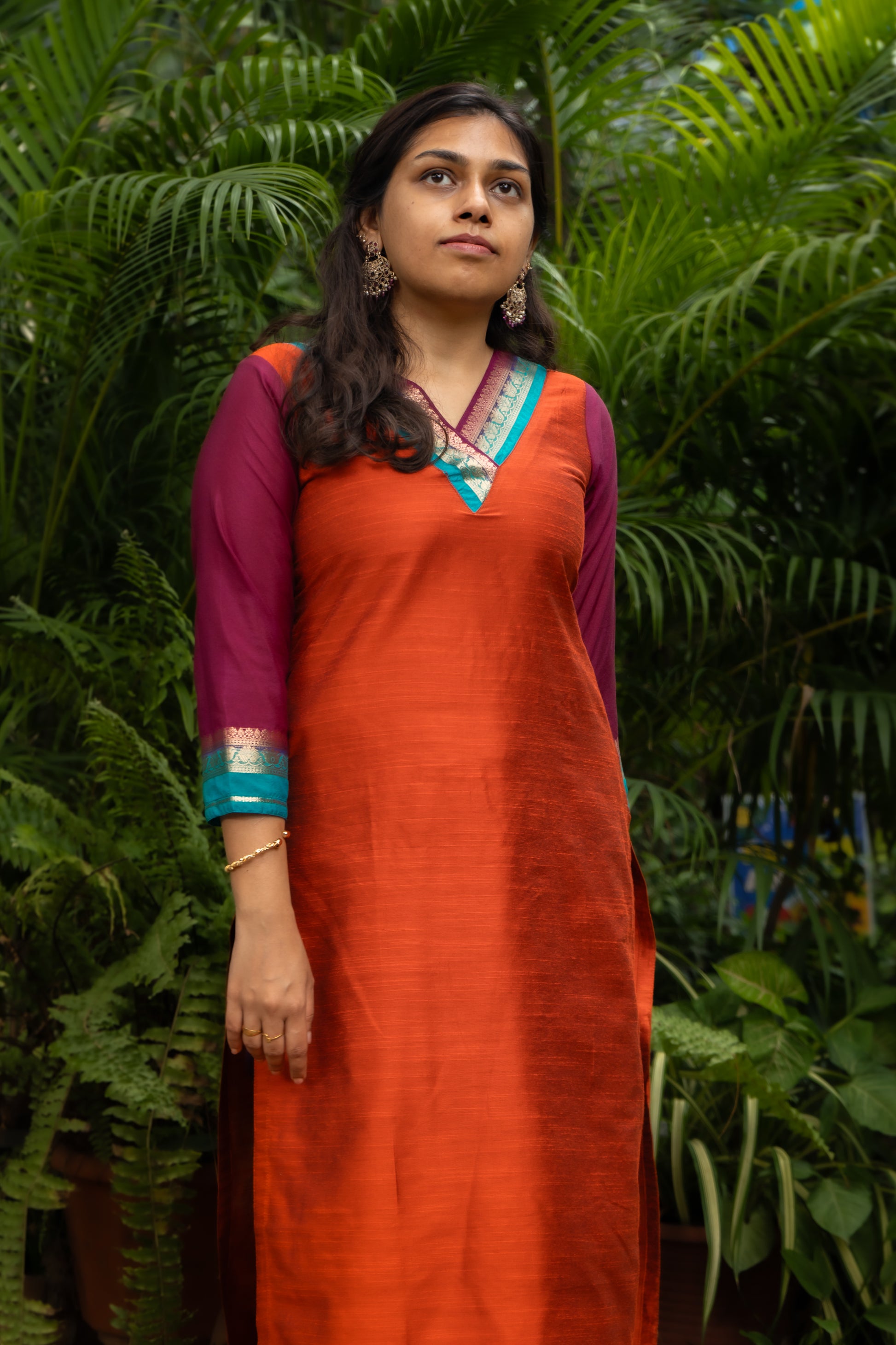 Crafted from rich dupion silk, this rust orange kurti features striking magenta crepe silk sleeves with elegant zari border detailing. The graceful V-neck and 3/4th sleeves add a refined charm, making it perfect for festive gatherings or elegant daywear. A blend of warm tones and classic craftsmanship, this piece reflects Sakyaa’s signature aesthetic — traditional, tailored, and timeless.