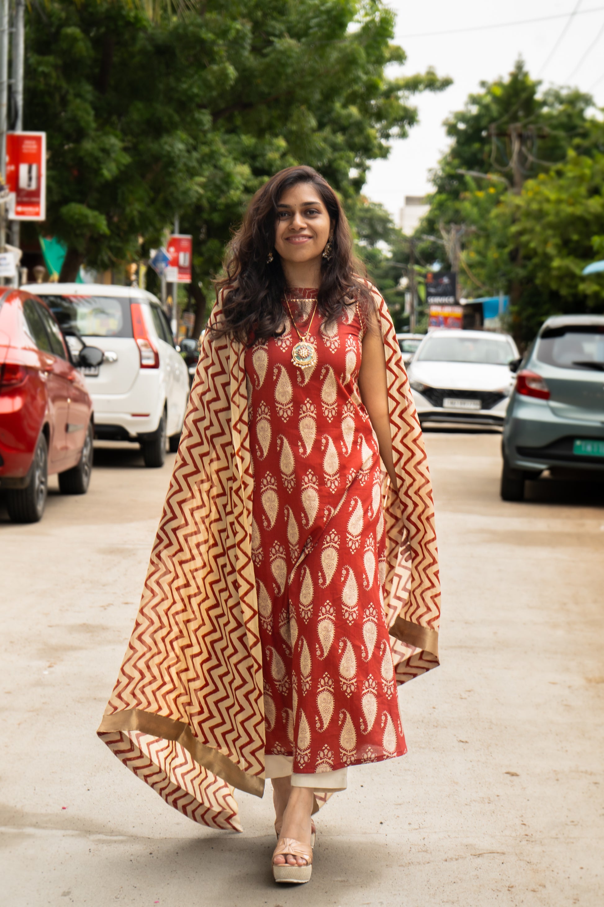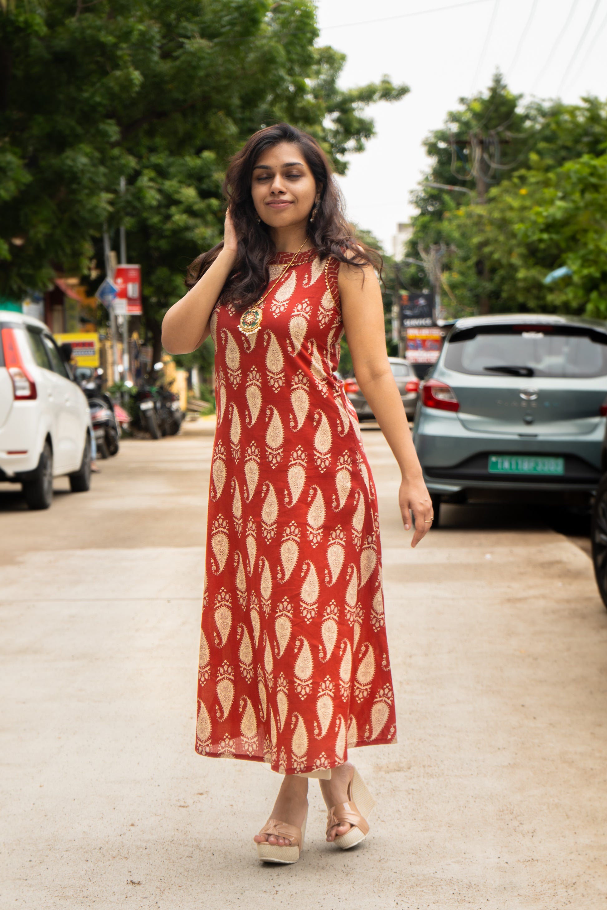 Crafted from soft, breathable cotton, this A-line kurti brings together everyday ease and timeless style. The intricate block prints lend a handcrafted charm, while the gentle flare of the A-line silhouette ensures a flattering fit. Designed in-house by Sakyaa, this piece balances traditional prints with modern tailoring — perfect for workdays, casual outings, or relaxed festive wear