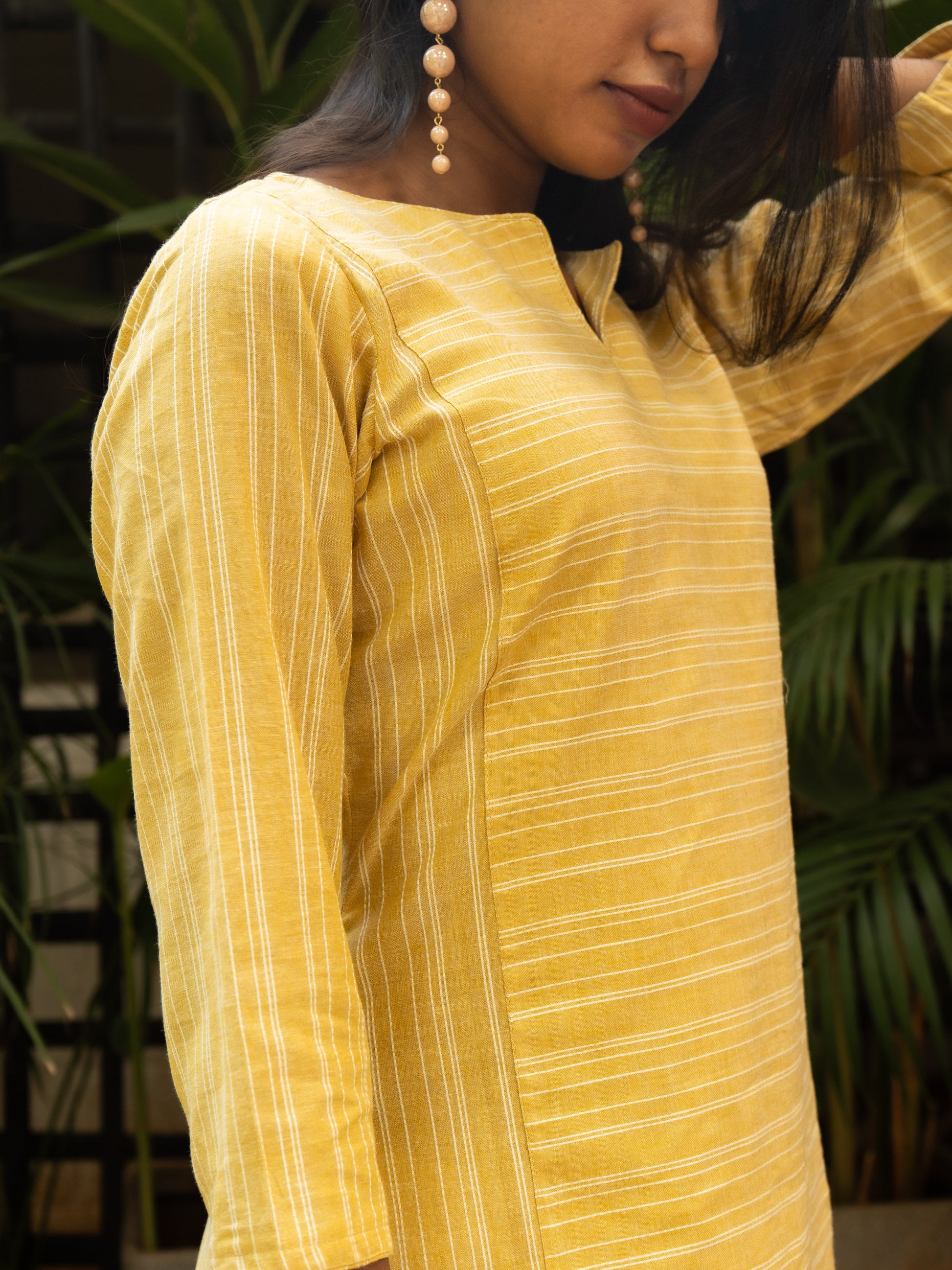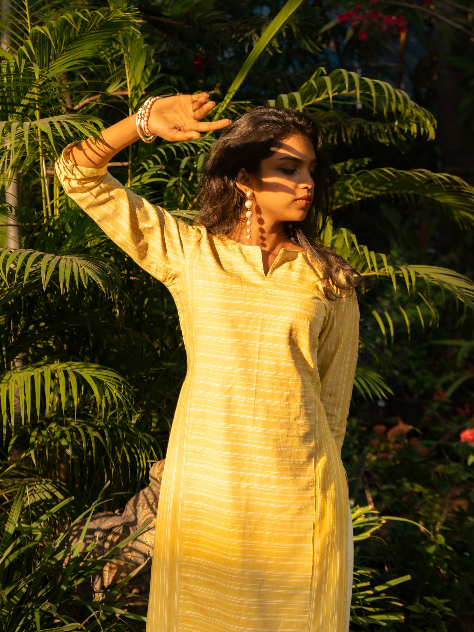 Brighten up your everyday ethnic wear with Sakyaa's Soft Yellow Handloom Kurti, designed for comfort and understated elegance. Featuring delicate white stitched pinstripes, this kurti is crafted from premium handloom cotton, ensuring breathability and ease for all-day wear. The subtle texture and minimalist design make it perfect for workwear, casual outings, or a simple festive look. A timeless addition to your wardrobe, this yellow handloom kurti is ideal for those who love effortless style with a traditional touch.